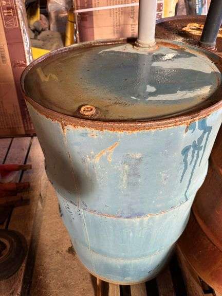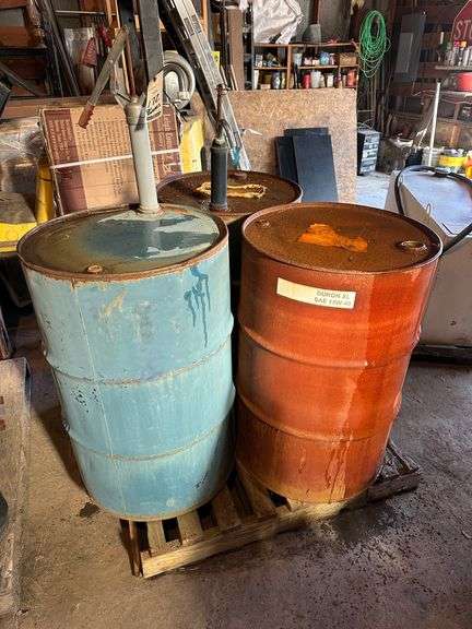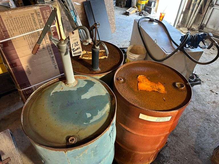 (3)-Barrels (two with seized hand pumps) (two barrels still with contents - contents unknown)