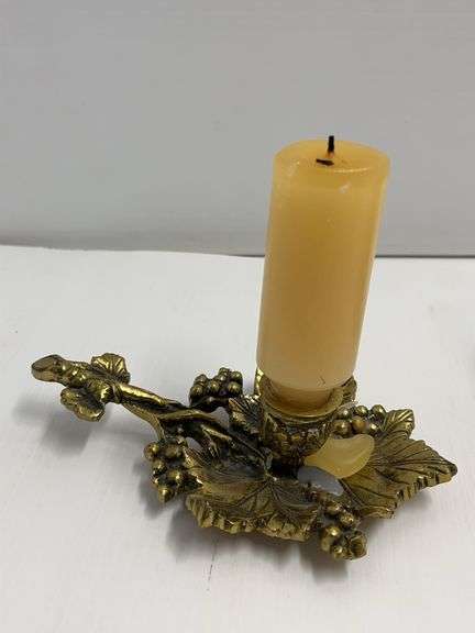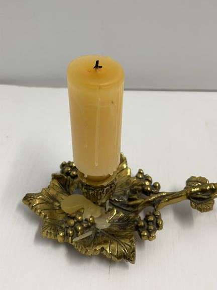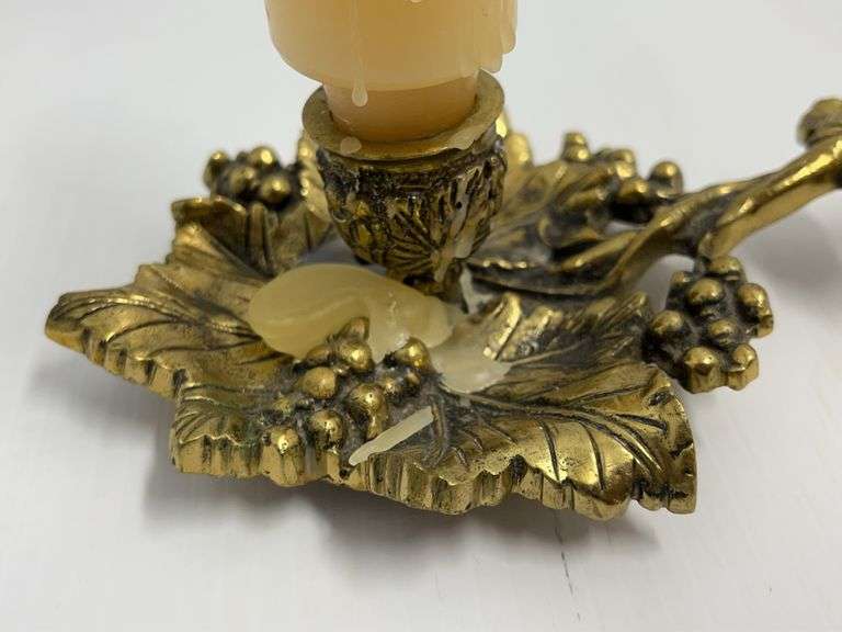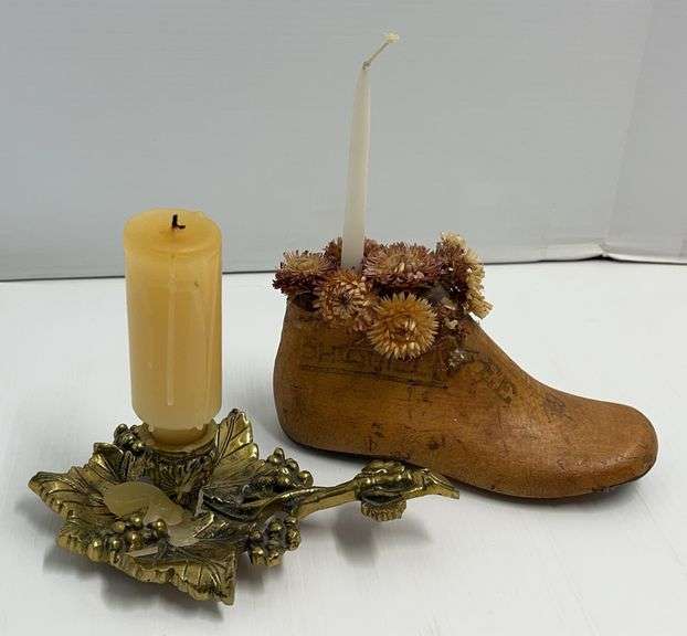 Repurposed Antique Wooden Shoe Last Candle Holder with Dried Flowers, and an Older Brass Candlestick Holder with Grape Leaf and Cluster Design