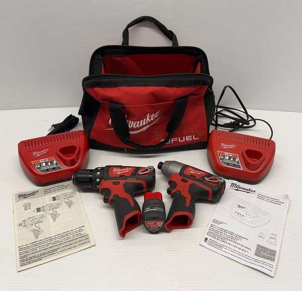 Milwaukee M12 Fuel Li-Ion Battery Chargers, and 3/8" and 1/4" Hex Drill Drivers in Bag